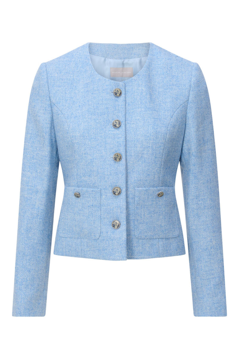 CLASSIC AND ELEGANT JACKET WITH A ROUND NECKLINE. THE COCO JACKET HAS  A PERFECT MODERN FIT, CLASSIC DESIGN AND IS MADE OF SHETLAND WOOL. THE COCO HAS BEAUTIFUL DELFT BLUE  BUTTONS THAT ENSURE AN ELEGANT APPEARANCE.